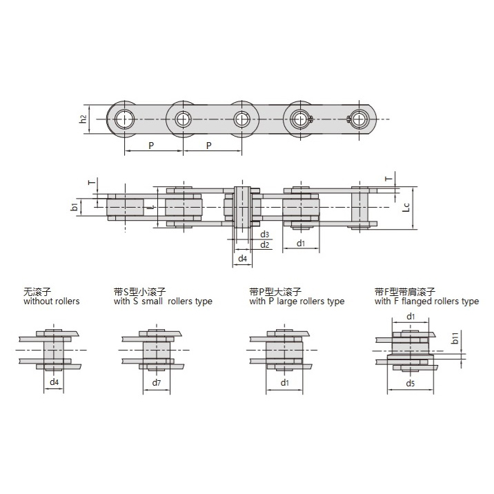 - Pieejama bez rullīšiem vai aprīkota ar S tipa mazajiem rullīšiem, P tipa lielajiem rullīšiem un F tipa plecu rullīšiem, lai nodrošinātu dažādas pārvades vajadzības.