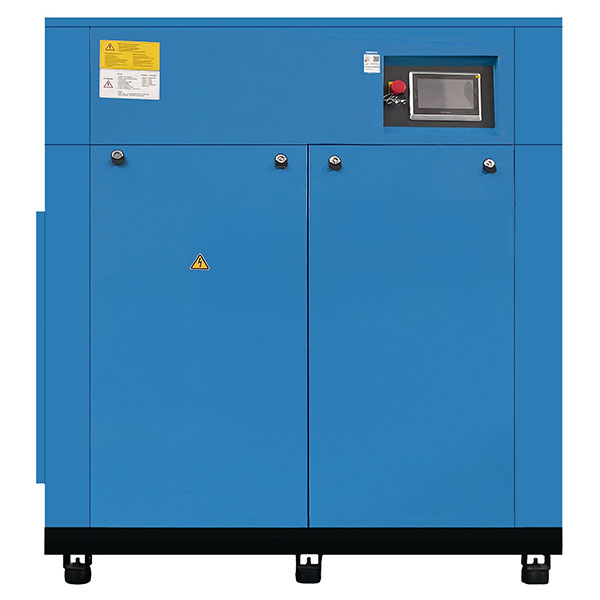 Kompresors darbojas ar divpakāpju skrūves kompresijas sistēmu: gaiss vispirms nonāk sākotnējā kompresijas kamerā un tiek saspiests, izraisot temperatūras paaugstināšanos. Pēc tam uzlabota eļļas iesmidzināšanas dzesēšanas sistēma pazemina gaisa temperatūru, pirms tas nonāk otrajā kompresijas kamerā, lai turpinātu kompresiju. Samazinātais kompresijas koeficients katrā pakāpē samazina enerģijas patēriņu un uzlabo kompresijas un tilpuma efektivitāti. Pastāvīgo magnētu sinhronais motors, ko kontrolē ar frekvences pārveidošanas tehnoloģiju, regulē motora apgriezienus atkarībā no reāllaika gaisa pieprasījuma, nodrošinot optimālu veiktspēju mainīgas slodzes apstākļos.