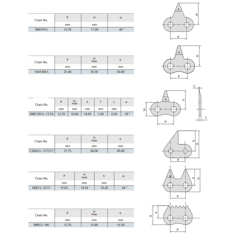 Nerūsējošā tērauda aso zobu ķēdes nosaka standartus attiecībā uz satvēriena jaudu, izturību un higiēnisko veiktspēju rūpniecisko materiālu transportēšanā. Specifisku vajadzību vai pielāgotu specifikāciju gadījumā konsultējieties ar savu piegādātāju, lai saņemtu pielāgotus risinājumus.